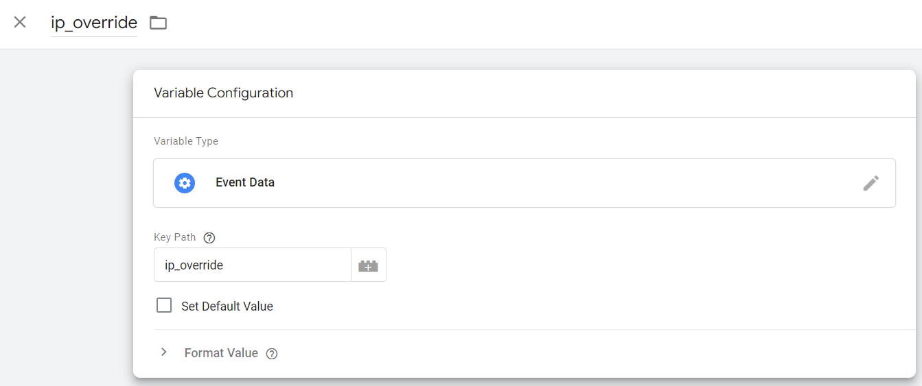 Als type variabele kies je Gebeurtenisgegevens. Als sleutelpad vul je ip_override in.