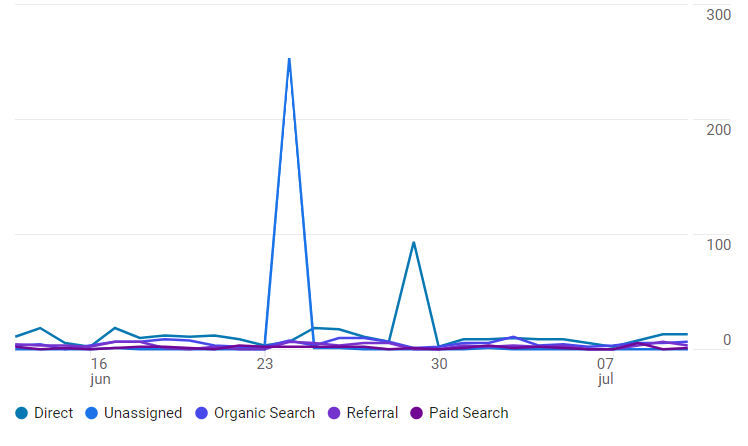 Als je Cookiebot op je website gebruikt, kan er een grote hoeveelheid verkeer in je Google Analytics property verschijnen op dezelfde dag iedere maand. Dit kan verwarrend zijn, vooral als je plotseling een piek in je verkeer ziet. Als je maandelijkse analyses uitvoert wil je dit soort pieken niet meenemen natuurlijk.