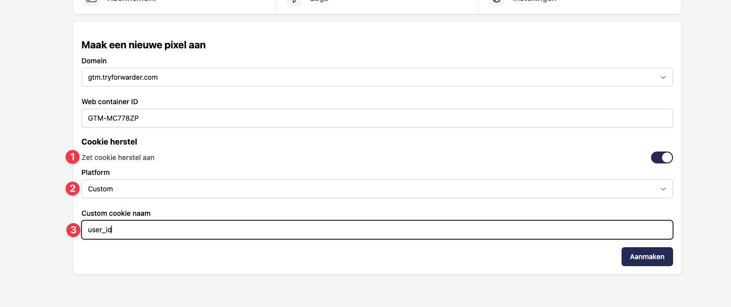 Nadat de cookie is aangemaakt moet je deze instellen in het web script. Dit kan als volgt in het tagging dashboard: