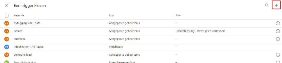 Bestaat de trigger nog niet? Klik dan op het blauwe plusje rechtsboven om een nieuwe trigger toe te voegen. Maak de trigger aan die correspondeert met de site-interactie die je wilt tracken. Dit kan een klik zijn, een specifieke pagina die bezocht wordt, een formulierinzending zijn, etc.