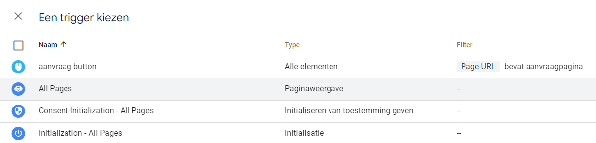Welke trigger je hier kiest, hangt volledig af van het type CMS waar je site op draait en welk CMP (Consent Management Platform) je gebruikt.
