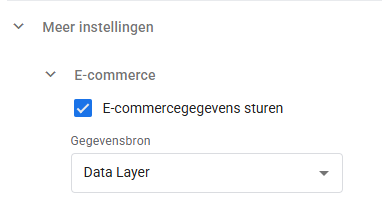 Alle andere gegevens uit de DataLayer die je in parameters aan een gebeurtenis wil hangen, laat je automatisch gebeuren. Dat doe je door onder Meer instellingen in de tag de optie E-commercegegevens sturen aan te vinken.