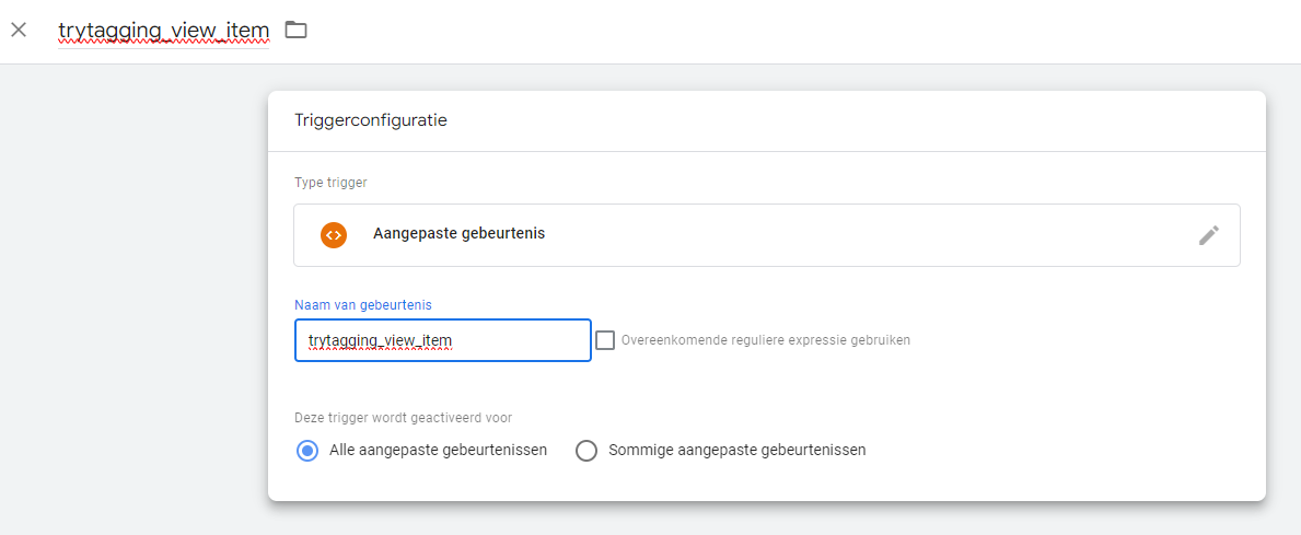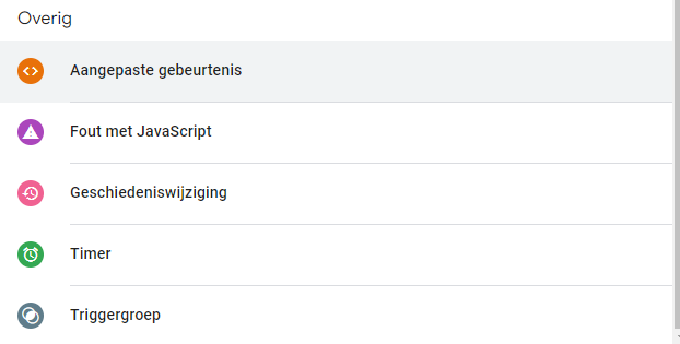 Voor een dataLayer event kies je de oranje optie Aangepaste Gebeurtenis als type triggerconfiguratie.