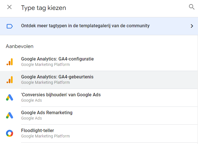 Klik op Tagconfiguratie en selecteer Google Analytics: GA4-gebeurtenis uit de lijst.