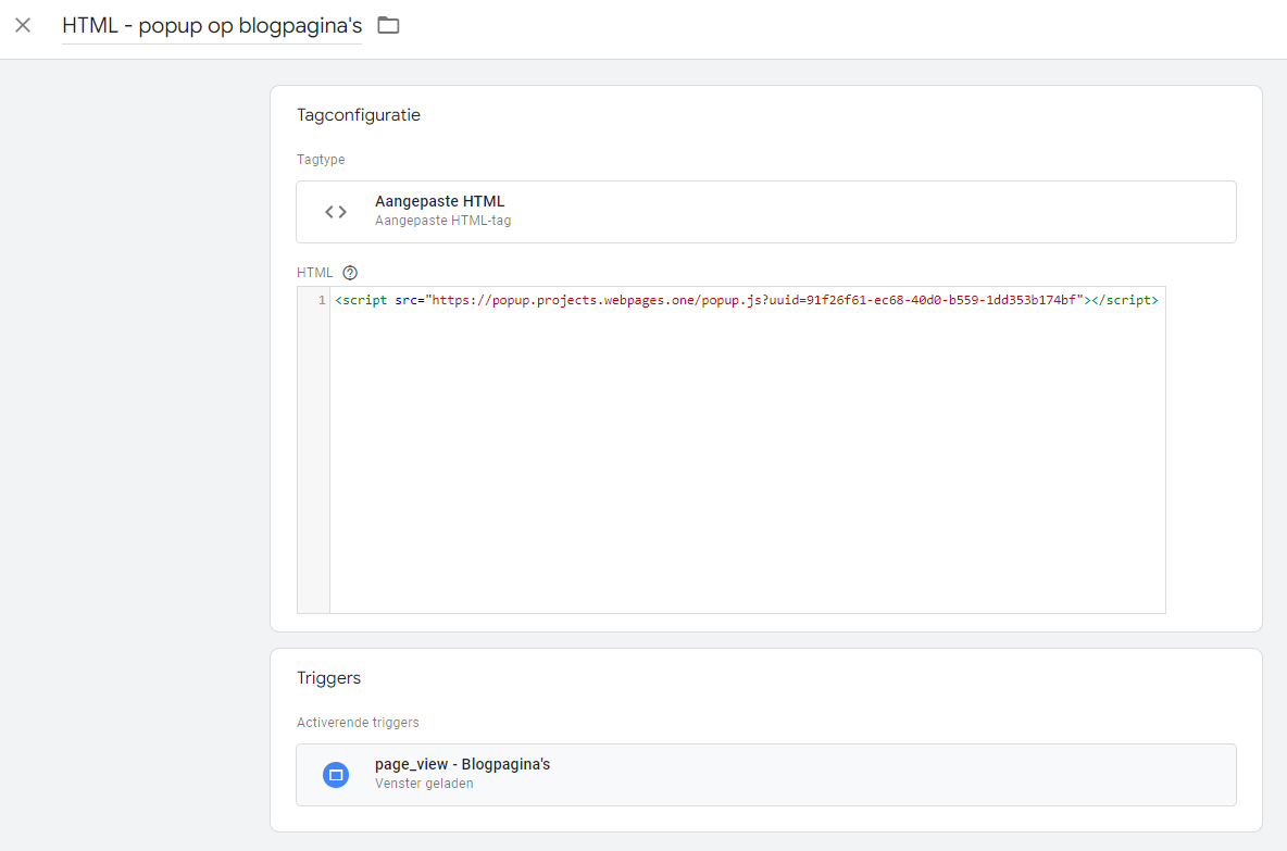 Selecteer de trigger waar je de HTML-code wil toepassen. Dit kan op alle pagina's zijn, dan kies je voor All Pages. Als dit voor een specifieke pagina is, dan maak je een trigger aan volgens dit stappenplan.