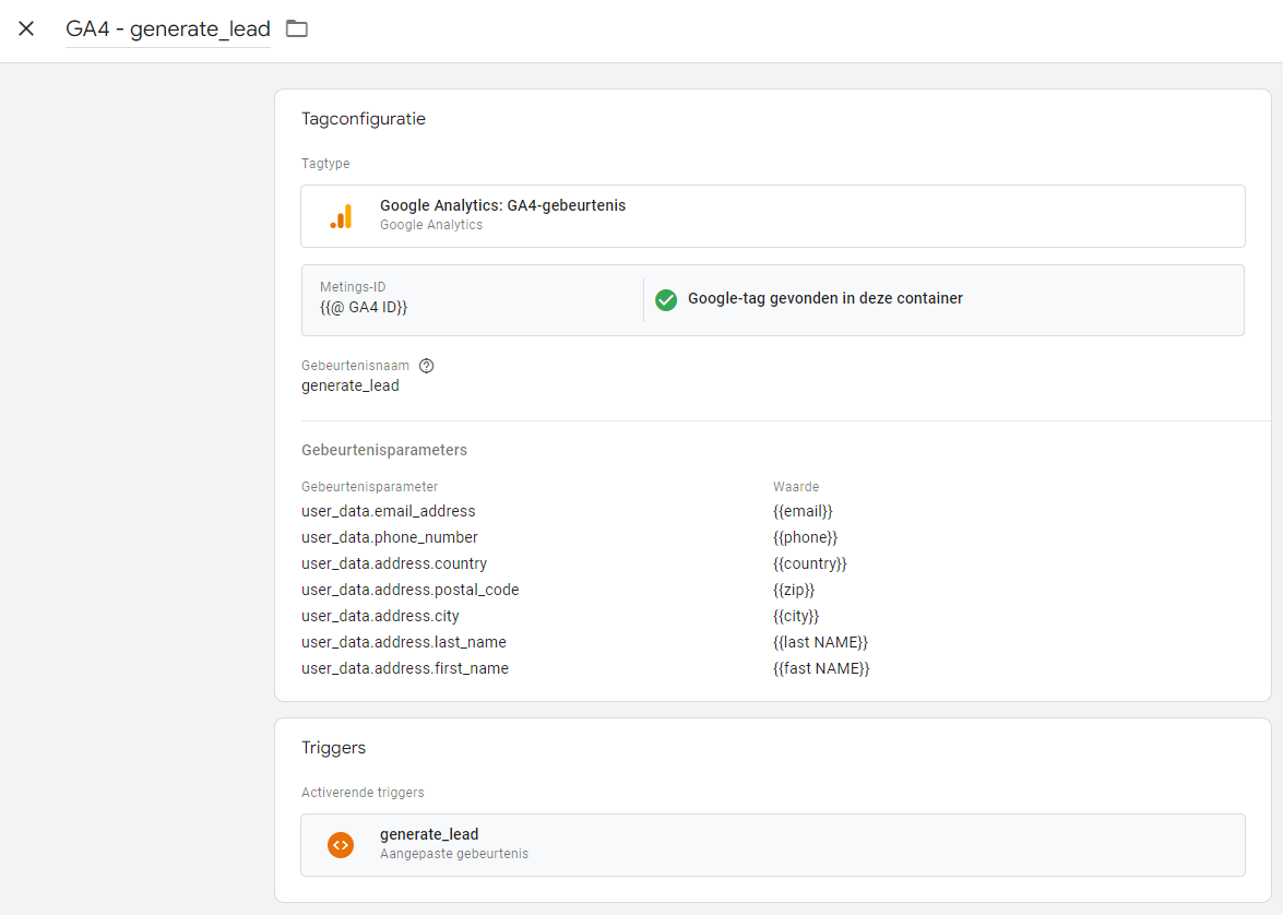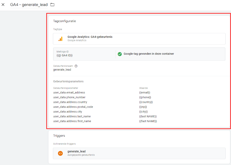 Zorg ervoor dat je marketing platofrm tag (facebook ads, tiktok ads, pinterest ads) met dezelfde eventnaam en trigger, dezelfde event ID variabele ingevuld heeft.