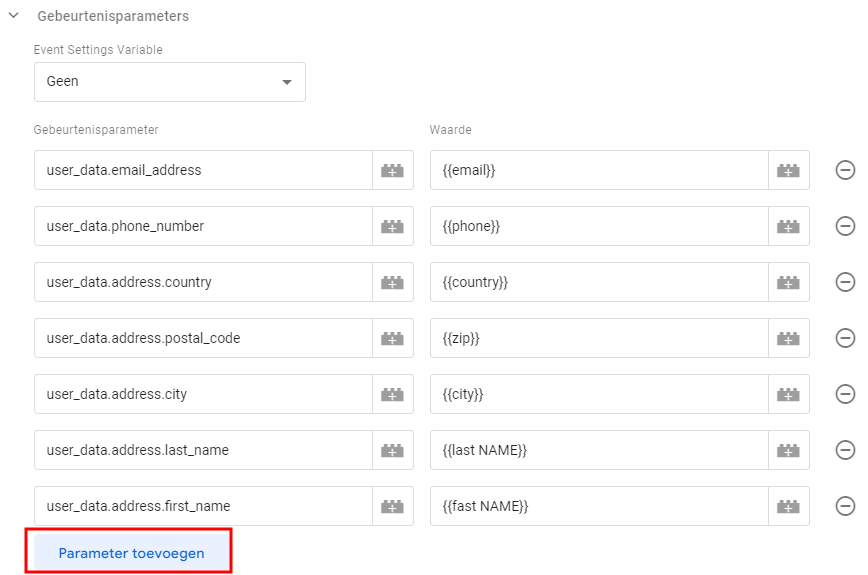 Als gebeurtenisparameter (links) vul je "event_id" in. Als waarde (rechts) vul je de event ID variabele in.
