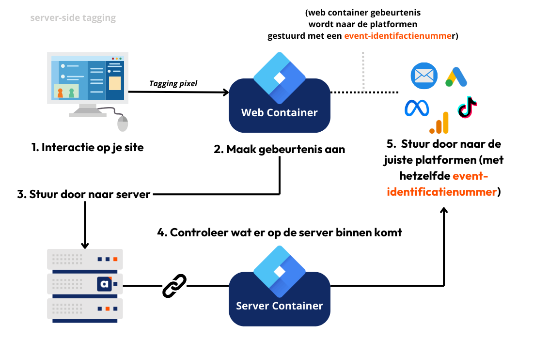 Wanneer je een gebeurtenis via Server-Side Tagging ook naar je Meta Gebeurtenisbeheer wilt sturen, zal je naast een Facebook Pixel tag ook een event_id als parameter toe moeten voegen aan de GA4 event tag. Deze GA4 event tag wordt namelijk naar de server verzonden, en vanuit de server weer verzonden naar Meta. Meta ontvangt dus een browserevent vanuit de Facebook Pixel tag op de web container en een serverevent vanuit je sGTM container, beide gebeurtenissen moeten dezelfde event_id hebben om goed te kunnen dedupliceren.