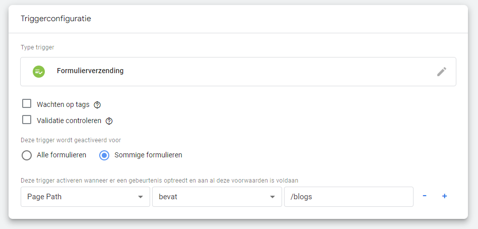 Vink de optie Sommige formulieren aan om de trigger alleen voor specifieke formulieren te activeren.