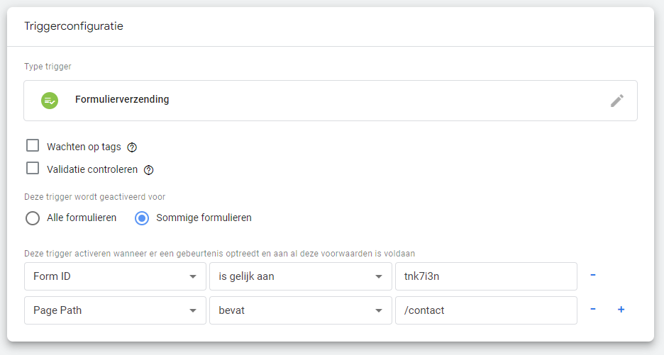 In het middelste dropdownmenu kies je de manier waarop je de voorwaarde uit de vorige stap wilt onderscheiden. In het derde vak, het invoervak, geef je de juiste parameter op. In de onderstaande screenshot zie je hoe het eruit ziet wanneer je wilt triggeren op alle bezoekers die een formulier met een specifiek formulier-ID invullen op een specifieke pagina.