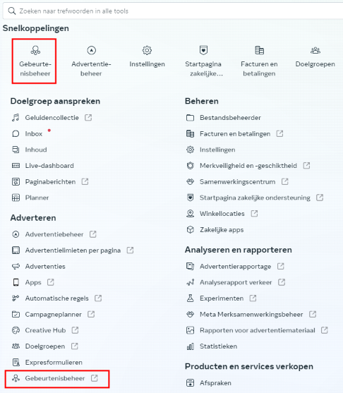 Zoek en klik op Gebeurtenisbeheer in het menu. Hier kun je al je pixels beheren.