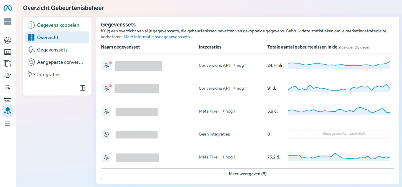 In het Gebeurtenisbeheer zie je alle ingestelde pixels voor jouw Business Account. Zorg ervoor dat je in het juiste Business Account zit door het dropdown-menu rechtsboven te controleren.