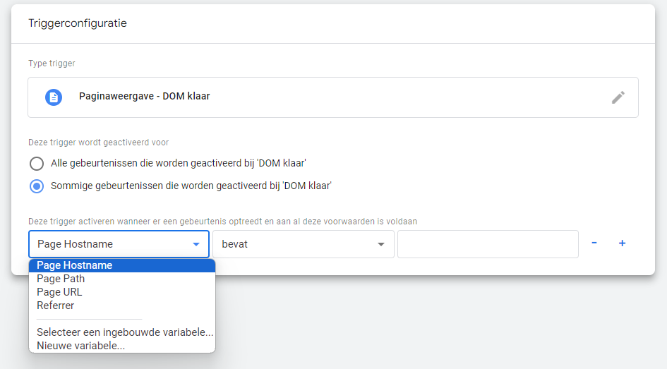 Selecteer uit het linker dropdownmenu een van de volgende variabelen waarop je de trigger wilt laten activeren: