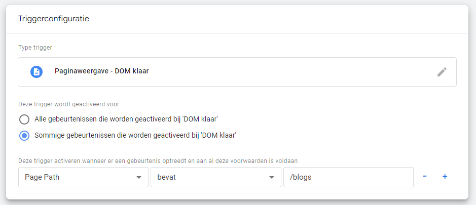In het middelste dropdownmenu kies je de manier waarop je de voorwaarde uit de vorige stap wilt onderscheiden. In het derde vak, het invoervak, geef je de juiste parameter op. In de onderstaande screenshot zie je hoe het eruit ziet wanneer je de trigger wilt activeren voor alle bezoekers die op een pagina terechtkomen waar /blogs in de URL aanwezig is.