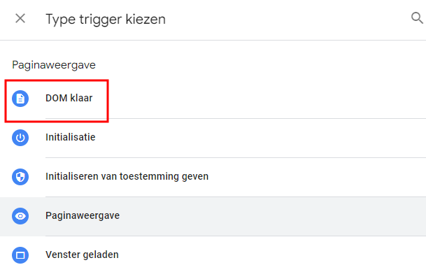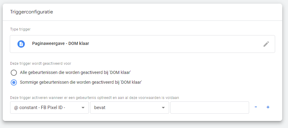 Klik op Triggerconfiguratie en selecteer DOM klaar als triggertype. Dit zorgt ervoor dat de trigger wordt geactiveerd wanneer de Document Object Model (DOM) volledig is geladen.