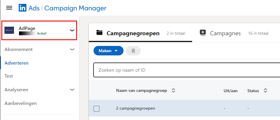 Zorg ervoor dat je het juiste accountnaam hebt geselecteerd in de linkerbovenhoek van de pagina.