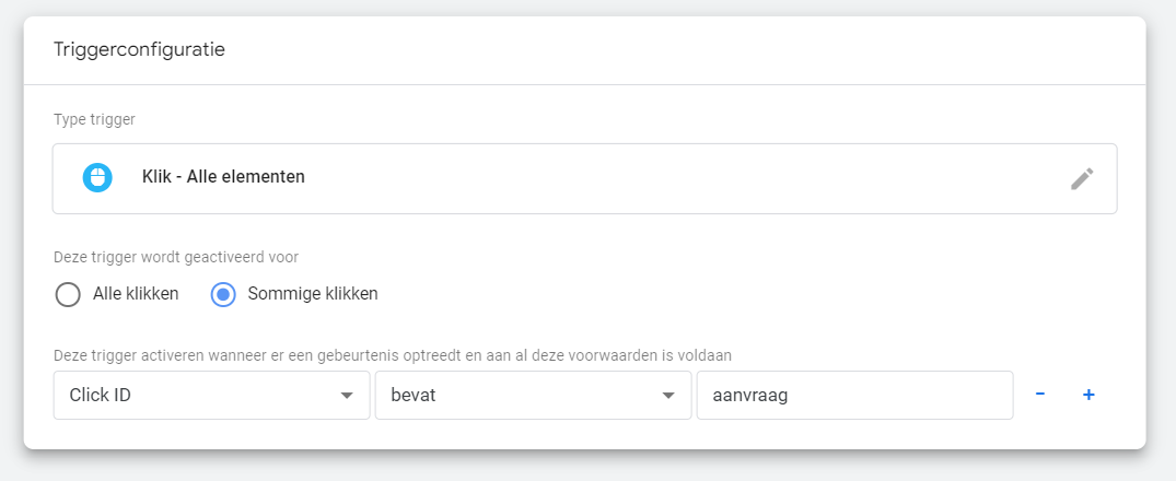 In het middelste dropdownmenu kies je de manier waarop je de klik wilt onderscheiden. In het derde vak, het invoervak, geef je de juiste parameter op. In de onderstaande screenshot zie je hoe het eruit ziet wanneer je de knop-klikken wilt bijhouden op alle knoppen met het HTML button-id: "aanvraag".