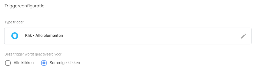 Klik op Triggerconfiguratie en maak de keuze uit het trigger op basis van een muis-klik of op basis van een hyperlink-klik. In het geval een algemene klik selecteer je Alle elementen en in het geval van een hyperlink-klik selecteer je Alleen links.