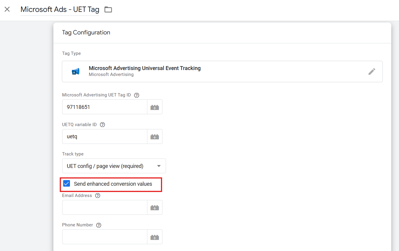 Wanneer je een nieuwe conversieactie binnen Microsoft Ads aanmaakt, krijg je de keuze om Enhanced Conversies in te stellen. Als je ervoor kiest om deze in te stellen zal je dit in moeten stellen via je UET Tag.