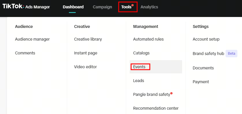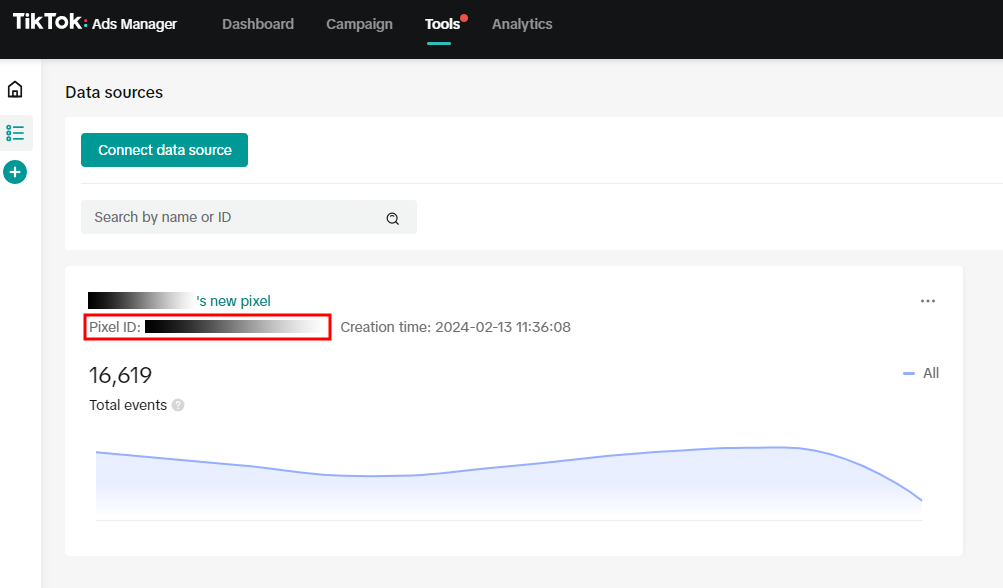 Klik in TikTok Ads Manager onder Tools op Events, en klik vervolgens op Data Sources.