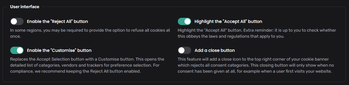 Hier zorg je ervoor dat je Enable the "Customise" button optie aan staat zodat bezoekers moeite moeten doen om cookies te weigeren door op de Customise knop te drukken.
