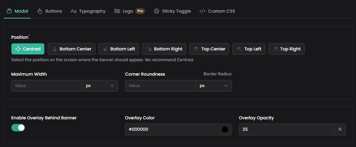 In de Styling opties onder Banner moet je ervoor zorgen dat je cookiebanner zo on-negeerbaar mogelijk is. Dat doe je door deze Centred te positioneren en de Enable Overlay Behind Banner optie aan te vinken.