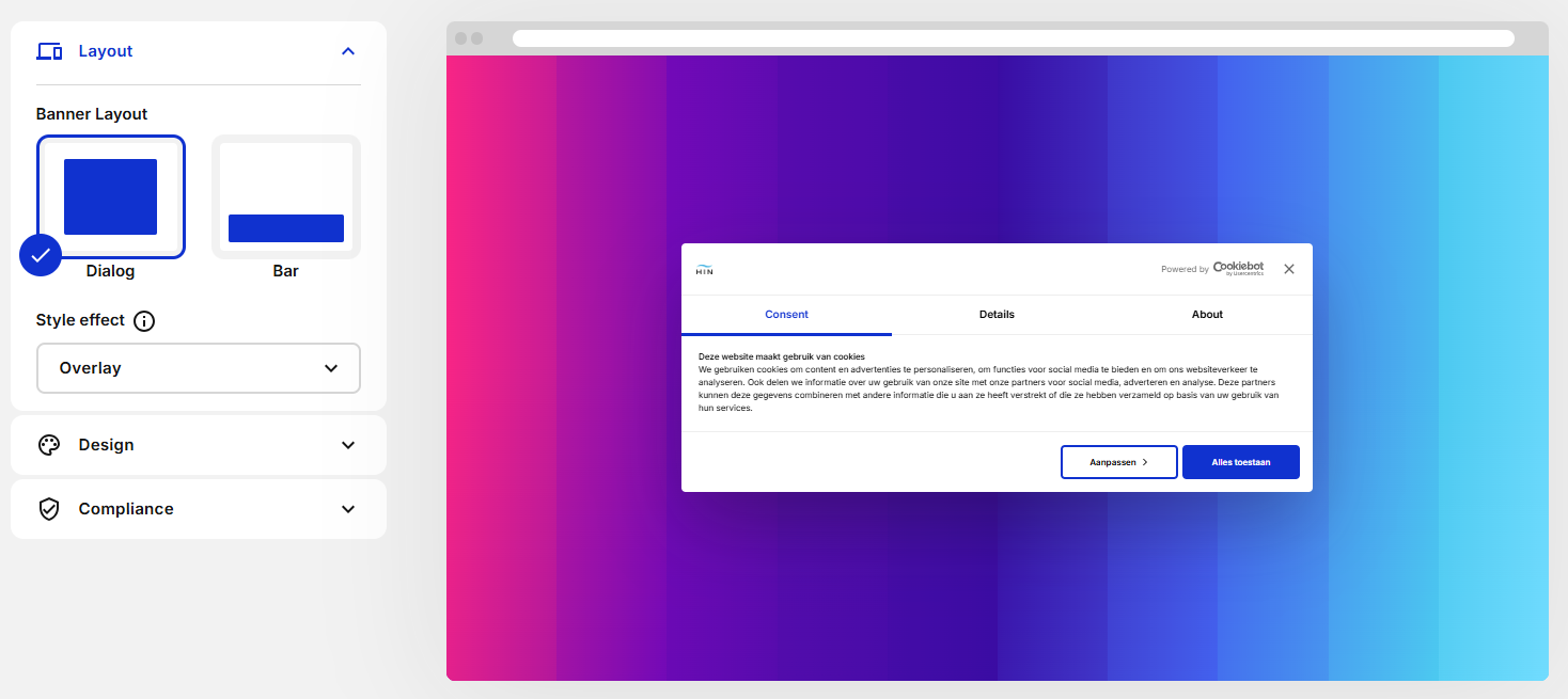 Als Layout kies je voor Dialog om de banner zo on-negeerbaar mogelijk te maken. Bij Style effect kan je voor Overlay kiezen om ervoor te zorgen dat bezoekers niet buiten de banner om kunnen klikken op site-onderdelen.