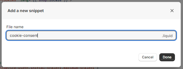 Noem de nieuwe snippet "cookie-consent" en klik op Done.