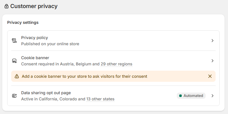 In de Customer Privacy instellingen van Shopify kan je aangeven welke cookiebanner je gebruikt, wat je in je Privacy Policy plaatst en andere instellingen die te maken hebben met het respecteren van de privacy van je bezoekers. In deze stappen zal er alleen uitgelegd worden hoe je aan kan geven dat je een app van een derde partij gebruikt als cookiebanner.