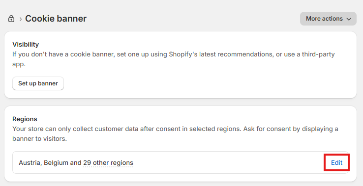 Gebruik je een andere cookiebanner dan de standaard Shopify cookiebanner, dan geef je hier aan voor welke Regions je de consent van bezoekers verwerkt.