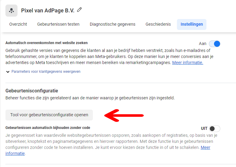 Ga naar de instellingen van deze pixel en scroll naar beneden tot je de Tool voor gebeurtenisconfiguratie kan openen.