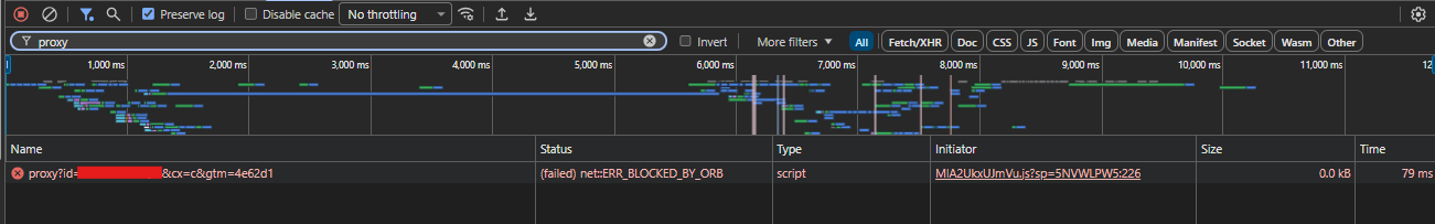 Je Google Tag stuurt een verzoek naar jouw proxy. Maar omdat Google Ads gekoppeld is aan dezelfde GA4 Measurement-ID, wil de tag óók nog even langs Google Ads servers. Die zitten op een heel ander adres dan jouw proxy. De browser ziet dat en denkt: "Hé, dit klopt niet. Je vroeg om iets bij server A, maar nu word je doorgestuurd naar server C zonder dat ik weet of dat veilig is." De browser blokkeert het dan gewoon. Dat is de ORB-fout.