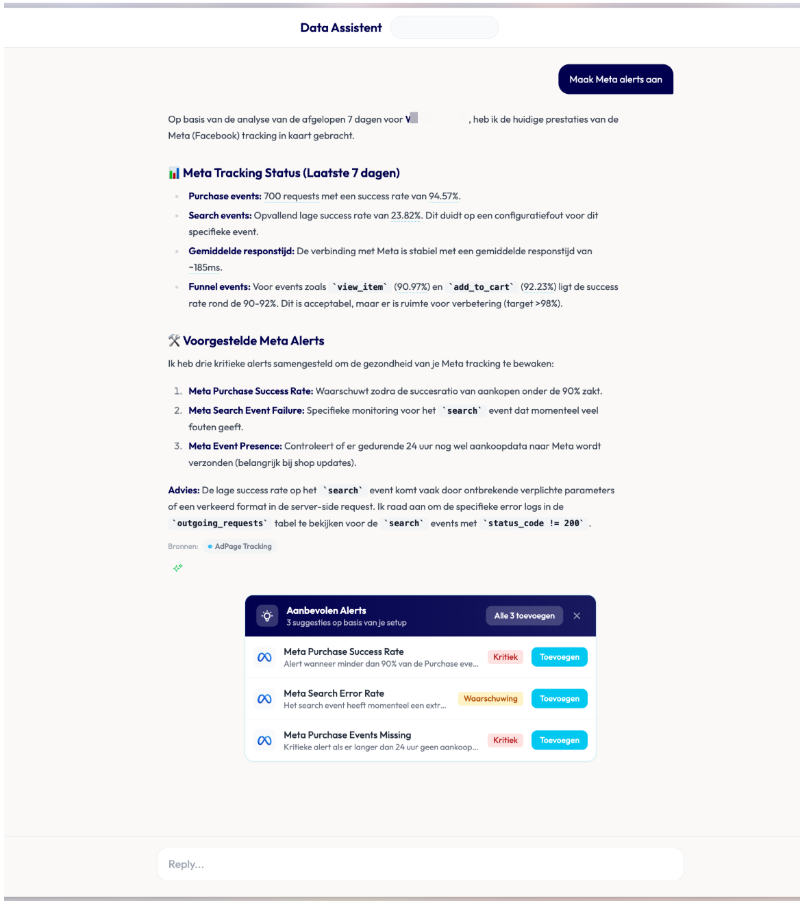 De Data Assistent analyseert je tracking data van de afgelopen 7 dagen en stelt relevante alerts voor op basis van jouw setup.