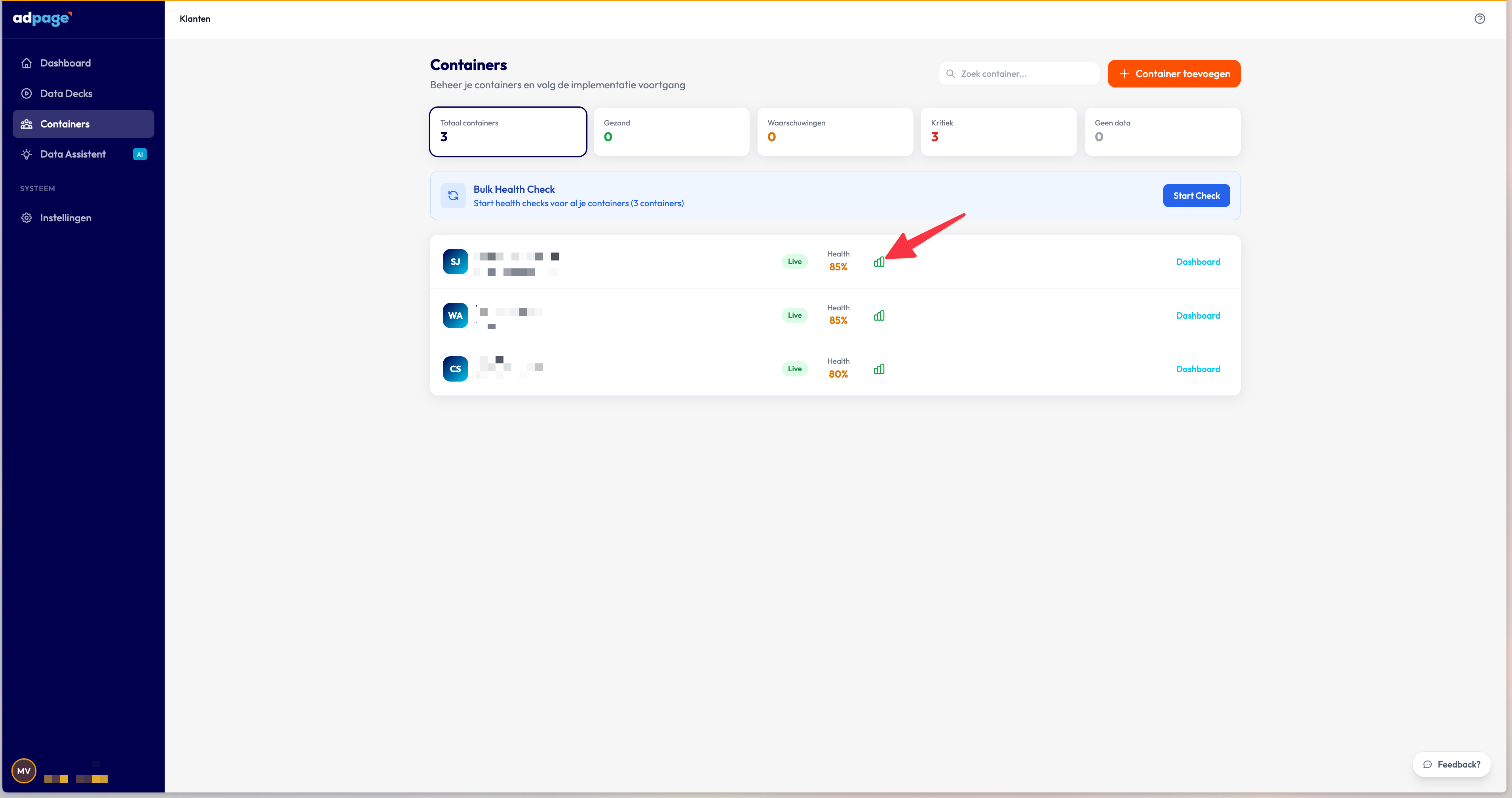 đĄ Tip: Via de Bulk Health Check bovenaan de containerpagina kun je in ÊÊn klik de health checks voor al je containers tegelijk starten.