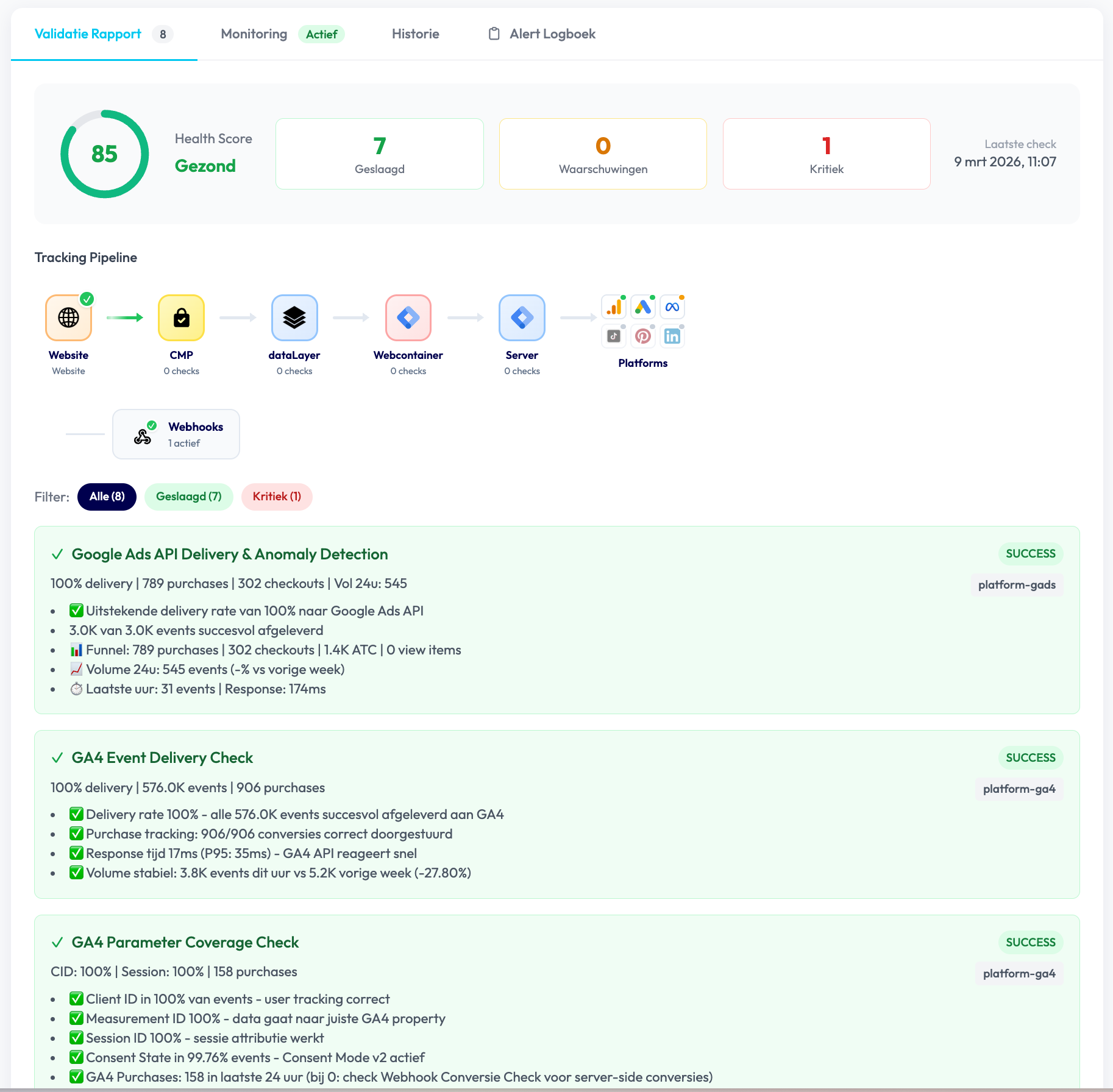 Elk container heeft een Validatie Rapport met een overzicht van alle actieve checks. Bovenaan zie je de Health Score â een cijfer van 0 tot 100 dat aangeeft hoe gezond je tracking pipeline is.