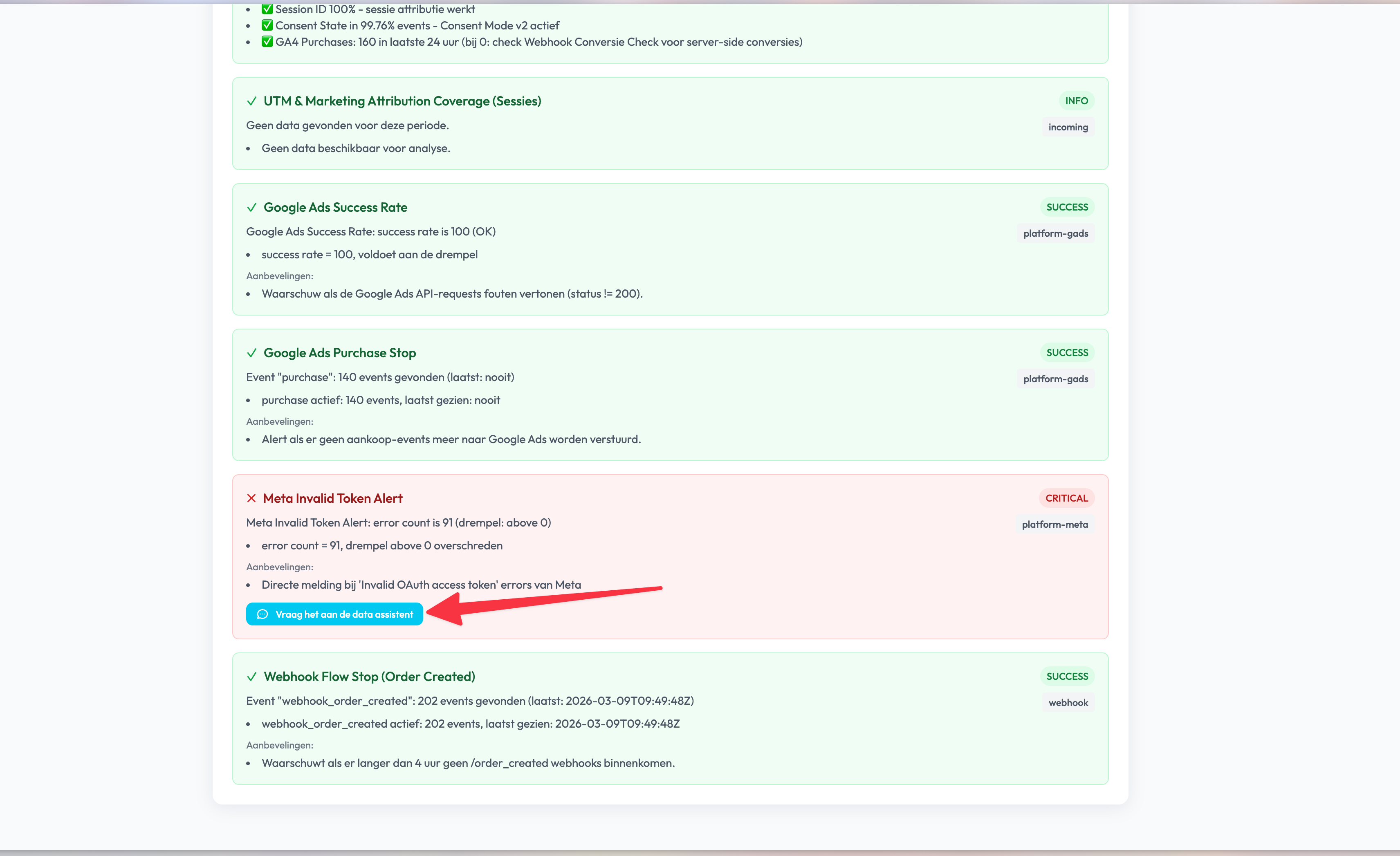 Voorbeeld: Bij een Meta Invalid Token Alert legt de Data Assistent uit dat dit vaak wordt veroorzaakt door een verlopen of ongeldig toegangstoken, en adviseert om de error logs in de outgoing_requests-tabel te bekijken voor requests met status_code != 200.