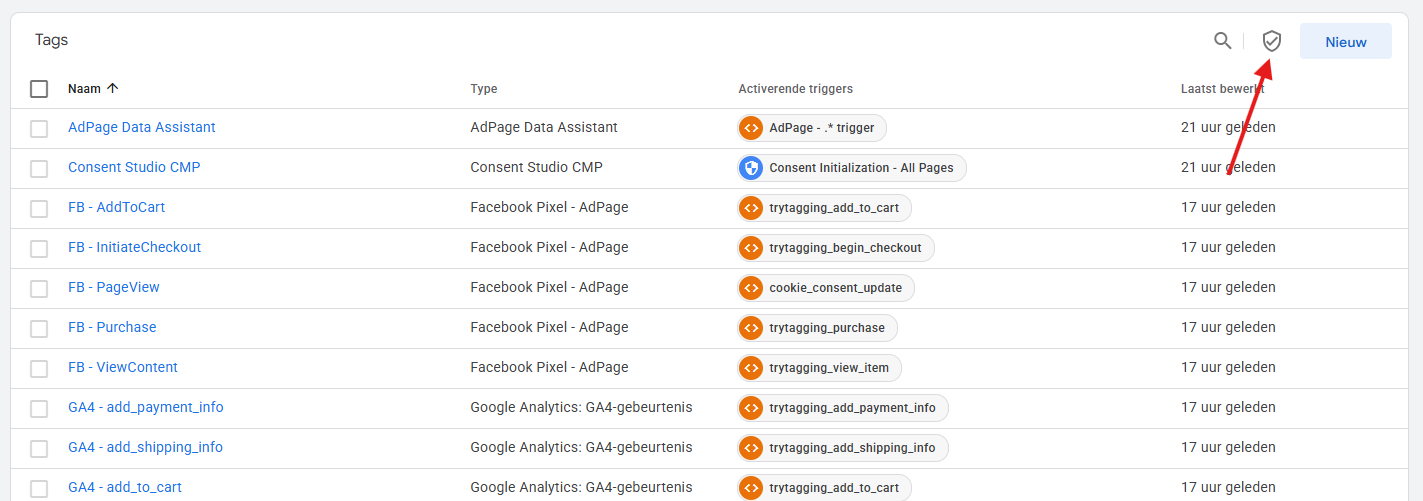 Controleer of de Consent Overview in je container nog correct is. In het tag-overzicht heb je rechtsboven een schild-pictogram om de consent overview instellingen te openen.