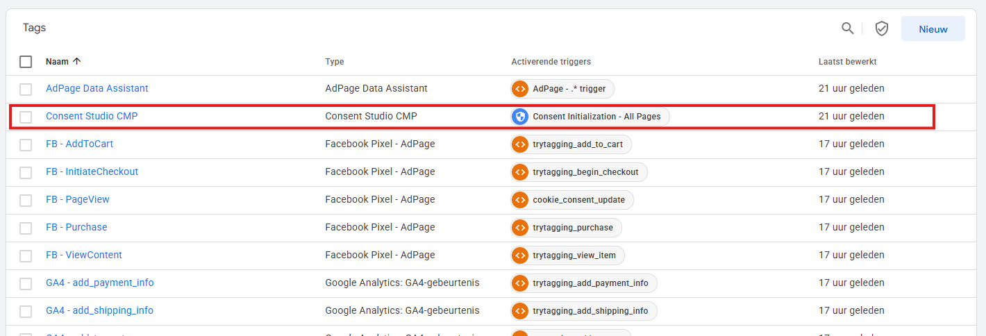Deze mag je verwijderen. Daarvoor in de plaats ga je de Consent Studio tag installeren.
