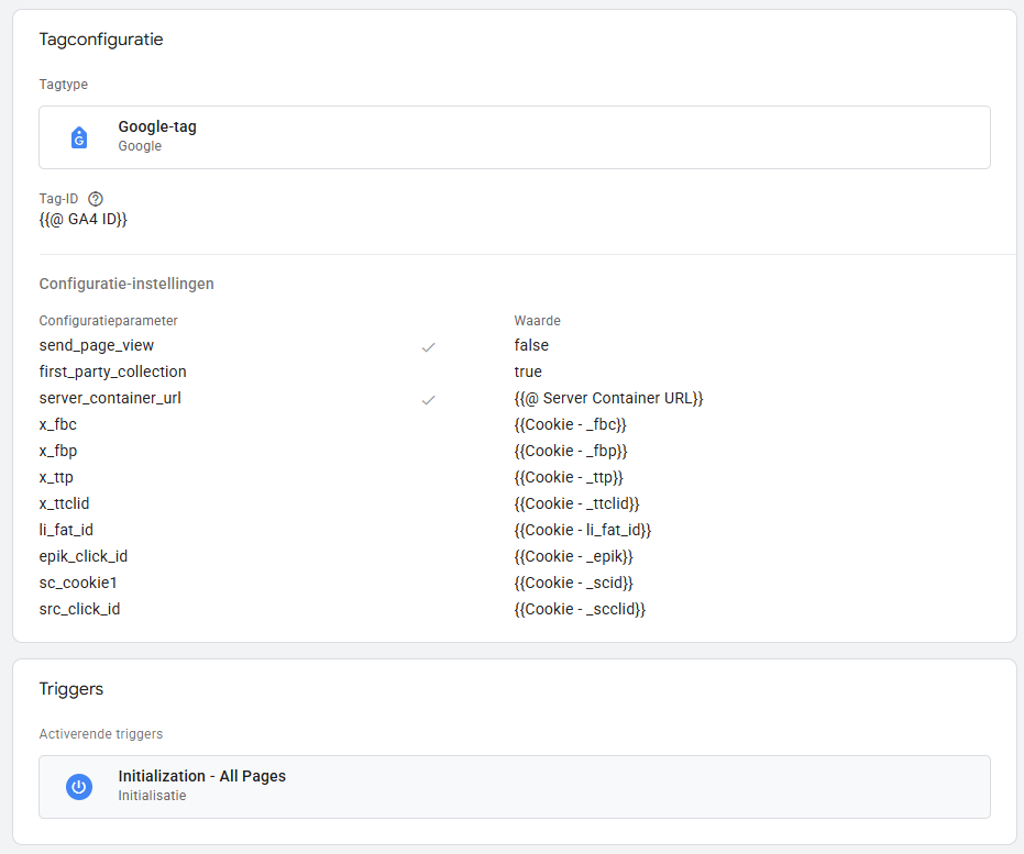 Als je alle bovenstaande parameters toevoegt aan je Google Tag, zal je Google Tag er op deze manier uitzien: